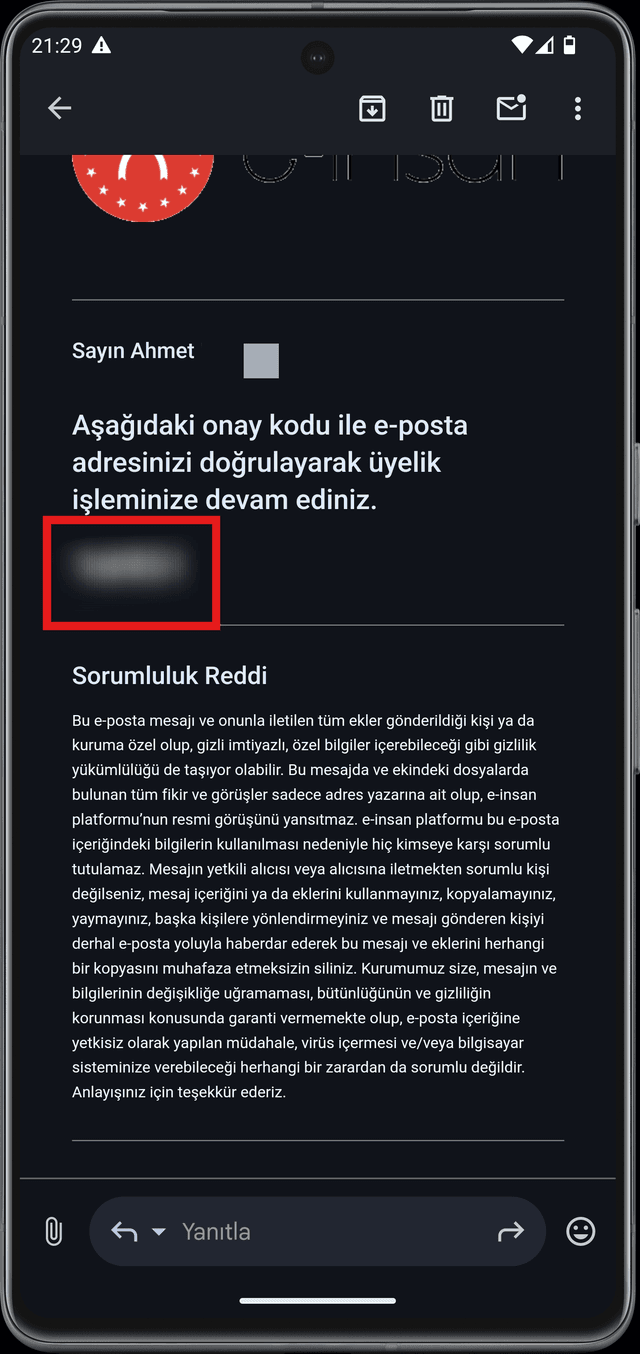 Bu sayfada, formda doldurmuş olduğunuz e-posta adresinize bir ileti gelecek. Sonraki adımda kodu nasıl alacağımızı göreceğiz.