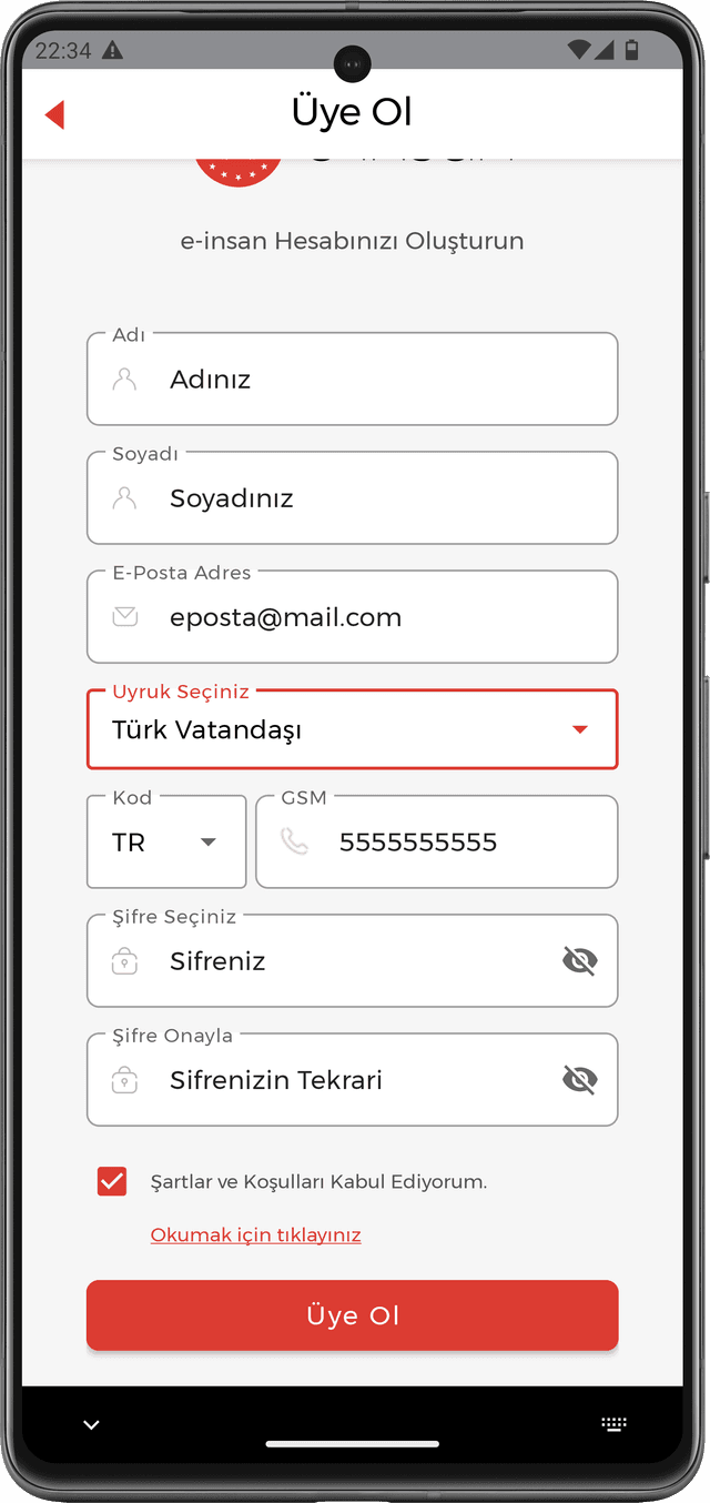 Formda istenen tüm bilgileri eksiksiz ve doğru bir şekilde doldurun. 'Şartlar ve Koşulları Kabul Ediyorum.' tikini işaretleyip 'Üye Ol' butonuna tıklayın.
